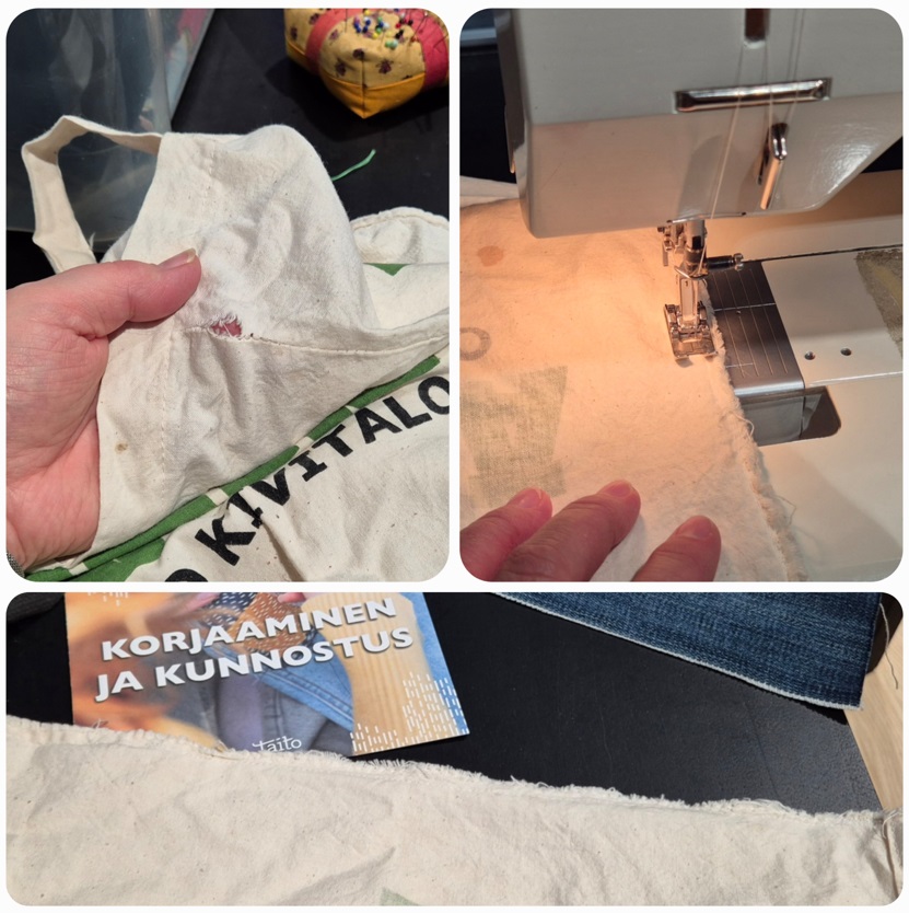 Seuraavaksi oli minun vuoroni päästä ompelukoneelle. Toinen korjattava oli mainoskassi, jonka toisesta sivusaumaan oli tullut repeämä. Tuosta sai helposti vedettyä suoralla tikillä uuden sauman ja samalla ompelin molemmat puolet vielä siksakilla, koska sitä ei alunperin ollut ja näin kassista tuli kestävämpi,