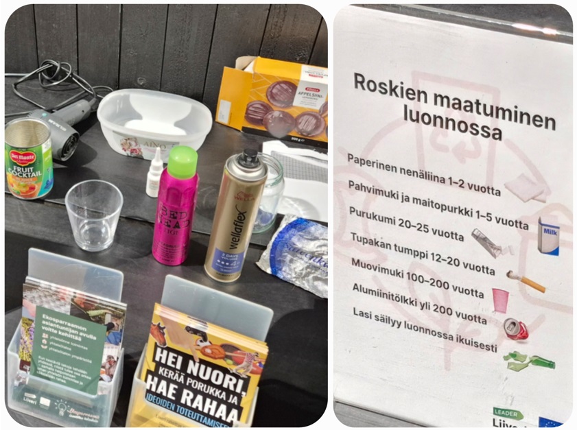 Kävin vielä kokeilemassa jätteiden lajittelua, joka meni nappiin, vaikken asu samalla jätehuoltoalueella. Päälinjat jätteiden kierrätyksessä Suomessa ovat yhteneviä. Samalla pöydällä oli listaa, kuinka kauan eri roskilla menee maatua luonnossa, joten tässä hyvä syy, miksi oma roska kannattaa aina kantaa roskikseen asti. Ja miksi esimerkikiksi muovisista kertakäyttötuotteista halutaan eroon, niitä kun luontoon pääsee valitettavan paljon.