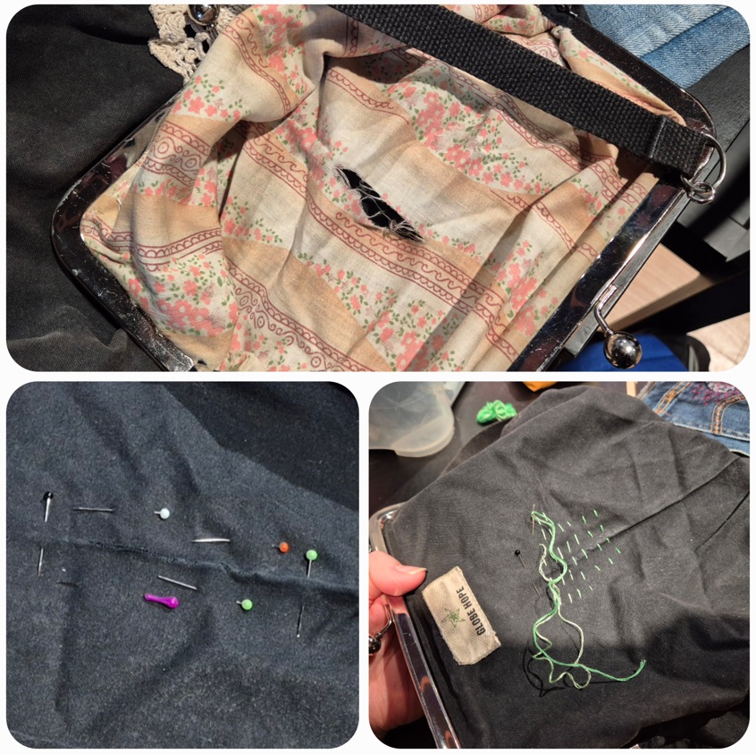 Tapahtuman mainoksessa ilmoitettiin, että mukaan voi tuoda oman jostain syystä tuunausta tarvitsevan työn. Tottakai tällaiseen tilaisuuteen kannattaa tarttua ja otin tätä varten kotoa mukaan pari jonossa olevaa korjaustyötä. Minulla on ollut puhkikulunut käsilaukku odottamassa korjausta. Siinä vuorikangas oli enemmän kärsinyt, mutta myös ulkopuolella oli jo pieni repeämä. Ja koska ompelukonelle oli jonoa, niin päädyin kokeilemaan tätä itselleni uutta tekniikkaa. Sain ujutettua päällikankaan ja vuorin väliin mustan tukikankaan, mutta alkuperäisestä suunnitelmasta poiketen en ommellutkaan paikkaa kiinni mustalla vaan päädyin näyttävämpään ratkaisuun.