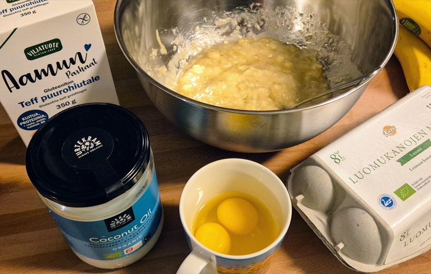 Lainailin tätä Hidasta elämää -sivuston reseptiä hiukan, jos joku haluaa vilkaista alkuperäisen version https://hidastaelamaa.fi/2022/09/hirmu-herkullinen-ja-helppo-banaanileipa-vain-kaksi-tyovaihetta/. Muutin ohjetta sen verran, että käytin tähän teffhiutaleita sekä Virtasalmen viljatuotteet durrajauhoseosta ja gluteenitonta vaaleaa jauhoseosta. Jos ei halua teffiä käytää, niin alkuperäisessä ohjeessa on kaurahiutaleita ja jauhot niiden kanssa eri suhteessa. Tämä onnistuu varmasti myös normijauhoilla, jos ei gluteenittomia käytä.